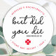 Mas você morreu? Kit de Alívio de Ressaca! Esses adesivos divertidos de favor de despedida de solteira são perfeitos para criar seus próprios kits de recuperação de ressaca para seus convidados, essenciais se você planeja ter um fim de semana de meninas fora. Visite nossa coleção de brindes de despedida de solteira, brindes de casamento e brindes de kit de ressaca e lembranças de casamento. Personalize com nome e data. COPYRIGHT © 2020 Judy Burrows, Black Dog Art - Todos os Direitos Reservados. Kit de Alívio de Ressaca Personalizado Mas você morreu Adesivo Redondo Clássico