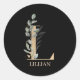Florial do monograma da letra L. A letra L na textura castanha ouro acentua-se com folhas compostas de aquarelas verdes, flores e salpicos de ouro derretidos. Personalizado com o nome na fonte correspondente.