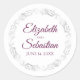 Estes adesivos elegantes para o casamento apresentam texto roxo, magenta ou manuscrito colorido em um fundo branco com uma borda floral de folha fina prateada. O texto é totalmente personalizável e contém os nomes dos casais de casamento e a data do casamento. Excelente como etiquetas de favor ou selos de envelope!