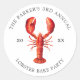 Autocolantes personalizados de lagosta Vermelha para a próxima festa de Assar de lagosta ou marisco. Apresenta uma ilustração com a forma aquosa de uma lagosta vermelha. Abaixo e acima, há pontos para as informações do menu de eventos.