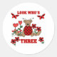 Uma joaninha de ursinho, flores vermelhas do coração, e texto que diz "Olha quem é três" em um design de aniversário de 3 anos bonitinho.