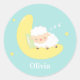 Um pequeno presente para os pequenos que tem um desenho de um cartoon de carneiro bonitinho a dormir na lua crescente com estrelas à sua volta. Esta paleta de cor pastel de azul, amarelo e branco é neutra em termos de gênero e é adequada para rapazes e raparigas. Personalize com o nome da criança.