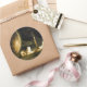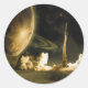 Arte espacial relembrando o estilo antigo da arte com um design de foguete retrô, lançando-se de uma lua orbitando um planeta alienígena.