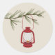 Uma etiqueta que caracteriza uma ilustração de uma lanterna de acampamento vermelha que pendura de um ramo verde.