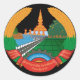 Emblema do Laos. O emblema nacional do Laos mostra o santuário nacional Pha Aquele Luang. Uma barragem é fotografada que como símbolo da geração de energia no reservatório Nam Ngun, uma rua asfaltada também é ilustrada, assim como um campo regado estilizado. Na parte inferior está uma seção de uma roda de engrenagens. A inscrição à esquerda diz "Paz, Independência, Democracia" e à direita, "Unidade e Prosperidade".