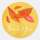Adesivo de agradecimento com tema de folhas de Outono ou Outono em laranja sobre fundo texturizado dourado. Padrão de folhas laranja e vermelhas pela artista Sacha Grossel. Ilustração em aquarela de um padrão frondoso com tema de estação Outonal.
