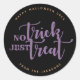 O adesivo do Dia das Bruxas preto, roxo e laranja "No Trick Only Tratat" no estilo minimalista da tipografia. Personalize com o nome. Excelente para a parte de halloween ou rótulo de tratamento.