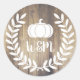 Silhueta de louros de fazenda branca russa sobre um fundo de planaltos de madeira de celeiro leve com iniciais de casal branco e silhueta de abóbora fofa.