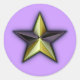 Estrela de metal azul escuro e amarelo-ácido em fundo de lavanda.