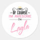 É claro que sou incrível que sou Layla - em sans mistos preto-e-rosa e letras decorativas cursivas com bordos brancos de rolagem e cortou uma coroa de ouro.