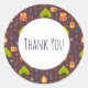 Um obrigado que você cola desenhado com um padrão de acampamento fofo. Ataques temáticos como uma fogueira laranja, uma tenda verde, uma guitarra acústica e outros elementos da natureza como árvores, folhas, e também uma mochila, pá e cantina. Legal padrão externo.