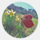 Fada com asas vermelhas e vestido roxo Cheirando no amarelo Daffodils Flores Fadas e Foto pelo artista Sandy Closs Fairy, fadas, píxias, píxias, fantasia, flores, borboletas, vermelho, amarelo, roxo, conto de fadas primavera, feira