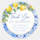 Limões de aquarela obrigado de aniversário de azulejos azuis italianos, seu adesivo redondo clássico.