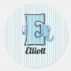 Excelente para identificação de brinquedos, projetos, livros ou para reserva de sucata. Nosso pequeno monograma de elefante com a letra "E" é feito em impressões listrados azuis e personalizado com o nome da criança.