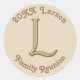 Se você está planejando uma reunião familiar, este adesivo oferece uma maneira barata de personalizar seu evento. O belo monograma de ouro e letra L prateada é centrado e cercado por sua informação personalizada de reunião. Adicione rápida e facilmente o ano e o nome da sua família. A cor de fundo sólida também pode ser personalizada se você desejar.