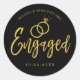 Um adesivo divertido e único com letra cursiva dourada sobre preto, feito sob medida para você para uma festa de compromisso. Ele apresenta a palavra "comprometidos" em dourado com anéis de casamento dourados sobrepostos. Abaixo e acima disso estão os nomes da noiva e do noivo e a data do compromisso.