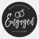 Um adesivo divertido e único com letras brancas sobre preto, feito sob medida para você para uma festa de noivado. Ele apresenta a palavra "noivado" com alianças de casamento sobrepostas. Abaixo e acima disso estão os nomes da noiva e do noivo e a data do noivado.