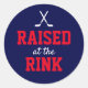 Levantado no Rink em vermelhos brilhantes e letra cursiva branca. Subiu com um par de bastões de hóquei cruzados brancos.