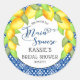Os limões amarelos boho-quic com diferentes tons de verde são descartados aparentemente sem esforço neste falso script dourado Chá de panela do design de texto do de texto do script de "aperto principal". Elegante e elegante para sua ocasião de chá de panela. Apresenta um fundo azul e branco com aparência italiana. Design composto por Designs Holiday Hearts.