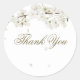 Elegante adesivo redondo clássico de agradecimento de flor de branca featuring delicadas flores da primavera emoldurando sua mensagem de agradecimento em um texto dourado elegante. Perfeito como adesivos de favor ou selos de envelope. Criado por Thisisnotme©