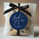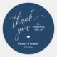 Modern Sweet Wedding Minimalist Thank You Gifts Classic favor Round Sticker, in classy handwriting script, cute little red heart, with bride and groom name and date, in Navy Blue.