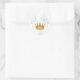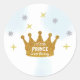 A little prince is on the way! Boy baby shower with gold crown and silver and gold stars with dreamy blue watercolor background
