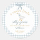 Add the sweetest finishing touch to your celebration with this Sweet Little Silly Goose Will Soon Be on the Loose round sticker. Designed with a soft blue gingham background, a charming white silly goose, and a coquettish blue bow, this personalized baby shower sticker brings a whimsical and polished detail to your baby boy or gender neutral shower decor.