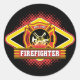 Logotipo de bombeiro com crachá de bombeiro com chamas furiosas, escada de incêndio e símbolos de hidrantes! Texto grande do bombeiro! Camisetas e presentes de bombeiros negros! Perfeito para arrecadadores de fundos e bombeiros! Cor vermelha e amarela brilhantes!