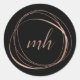 Os adesivos elegantes para monogramas apresentam um logotipo de círculo abstrato em dourado falso rosa, rodeando suas iniciais ou monograma em um roteiro de caligrafia moderno sobre fundo preto. NOTA: NÃO HÁ FOLHA DE OURO NESTE PRODUTO. O efeito ouro-rosa é criado usando sutis variações de cor que imitam o aspecto da folha.