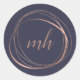 Os adesivos elegantes para monogramas apresentam um logotipo de círculo abstrato em dourado falso rosa, rodeando suas iniciais ou monograma em um roteiro de caligrafia moderno em um fundo azul-da-noite. NOTA: NÃO HÁ FOLHA DE OURO NESTE PRODUTO. O efeito ouro-rosa é criado usando sutis variações de cor que imitam o aspecto da folha.