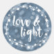Feliz Hanukkah! Adicione o toque perfeito de acabamento aos seus envelopes ou presentes com estes adesivos festivos. Design apresenta um fundo azul de boque, quadro branco estrelado e "Amor e Luz" em texto branco de bruxaria.