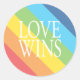 Este design moderno e colorido celebra a nova lei de igualdade de casamentos. Apresenta um fundo com linhas nas cores do arco-íris e as palavras "Love Wins" em letras brancas. Este design de na moda celebra o amor e o casamento para hetero e pessoas.