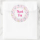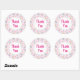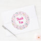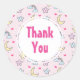 Um padrão fofo com estrelas felizes, lua, nuvens e arco-íris num fundo cor-de-rosa macio e pastel. Um círculo branco em camadas sobre o topo com a dentro escrita "Obrigado".