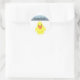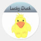Um pato amarelo giro com um grande bico laranja. Diz-se que "pato sortudo" pode ser mudado se assim o desejar.