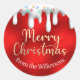 Esta etiqueta adesiva de Natal apresenta uma design de Natal colorida e festiva sobre um fundo de textura vermelha brilhante. Uma sequência de luzes é colocada sobre a fusão da neve através da parte superior. Uma saudação de "Feliz Natal" é impressa no centro em letra dourada. Um nome de família de exemplo é impresso na parte inferior que você pode personalizar para incluir seu próprio nome personalizado ou outro texto.