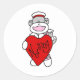 Uma enfermeira de macacos-meias com um grande coração vermelho que lê "Enfermagem" nele, em I Love Nursing T-shirts, canecas, adesivos, botões, sacos de tote, ímãs, mousépias, capuzes e outros artigos de roupa de enfermeira e de presente.