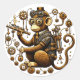 Um macaco de inspiração steampunk vestido com traje mecânico intrincado. O macaco veste óculos, colete e um pequeno chapéu, enquanto segura um complexo dispositivo mecânico parecido com uma arma de raios. Ao redor dele estão engrenagens, canos e outros elementos industriais, criando uma estética steampunk rica e detalhada. Os tons de ouro das partes mecânicas contrastam com o pelo natural, misturando temas orgânicos e mecânicos.