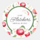 Um adesivo botânico clássico para qualquer evento com ilustração botânica das maçãs vermelhas e borda verde. Todo o texto pode ser personalizado para ajudar a criar um adesivo personalizado para seu evento especial, seja no piquenique no parque, no churrasco de verão, na festa de aniversário ou na festa de reagrupamento familiar!