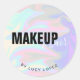 Design de maquiagem e colante redondo de cabelo com textura holográfica colorida e letra elegante de caligrafia.