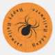 Estes adesivos assustadores têm uma aranha viúva negra numa teia contra um fundo laranja e as palavras: Feliz Dia das Bruxas.
