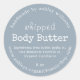 Adesivos azuis redondos elegantes para manteiga corporal batida artesanal, apresentando nome da empresa, ingredientes, peso e site. Perfeito para cuidados com a pele orgânicos, loja de produtos naturais artesanal e branding de pequenas empresas com um visual azul suave e minimalista.