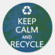 Mantenha calma e reciclar no dia da Terra e todos os dias. Este produto lembra que você reduz sua pegada de carbono colocando materiais recicláveis na caixa do reciclagem no trabalho ou em casa. O fundo azul verde terrestre com símbolo branco de reciclagem, e texto que lembra o ditado engraçado britânico "manter a calma e o carregar". Copyright © www.CuteComfy.com