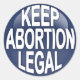 "Mantenha o aborto legal." Texto azul/branco em círculo, em t-shirts, botões, autocolantes, presentes.