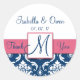 Casamento tema damasco Floral marinho Azul e Branco Obrigado Sticker com cor de sotaque rosa e inicial de monograma. Design por Elke Clarke©. Gráficos licenciados. Precisa de uma cor diferente ou contacte luxuryweddinginvitations@gmail.com