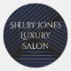 Este adesivo chic salon business apresenta as informações da sua empresa em tipografia elegante no marinho azul e fundo listrado dourado. A design lembra cortinas prestes a se abrir atrás do texto branco. Personalize essas etiquetas com seu nome corporativo para um acessório de correio moderno.
