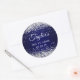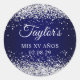 Crie seus próprios adesivos redondos clássicos de festa de aniversário de 15 quinceanera. Menina, brilha prateada cintilante sobre um gráfico de fundo ombre azul-marinho escuro. Personalize os estilos de fonte para criar seu próprio design para sua celebração especial. Uma caligrafia elegante clássica emparelhada com uma fonte serif de todos os bonés. As brilhas e os brilhos são a arte digital que impressão gostam de uma foto.