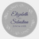 Esses adesivos elegantes para o casamento apresentam texto azul de roteiro do marinho rico em um fundo de cinza com uma borda floral de folha fina prateada. O texto é totalmente personalizável e contém os nomes dos casais de casamento e a data do casamento. Excelente como etiquetas de favor ou selos de envelope!
