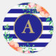 Acrescente um toque de luxo à vida cotidiana com esses adesivos quic redondos com faixas marinhos e brancas, um círculo azul marinho com uma rica borda dourada e monograma dourado, adornados com lindos rosas cor-de-água rosa e folhagem. Faz um presente de excelente também!