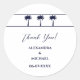 Adicione um toque de charme à beira-mar aos seus favores com este obrigado de casamento costeiro personalizado que você cola, com um design gráfico chic de três palmeiras azuis marinhos e uma sutil faixa azul detalhando colocado sobre um fundo na moda, branco nítido. Perfeito para um casamento de palmeiras ou de praia, esta design captura a beleza serena do mar e a elegância tropical. A elegante fonte do script de tipografia e caligrafia graciosa adiciona um toque sofisticado, fazer um detalhe de acabamento ideal para seu obrigado que você dá e favorece.