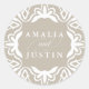 Coloque seus envelopes de casamento, favores e muito mais com nossos elegantes adesivos marroquinos inspirados em marinho e branco. O Round design apresenta seus nomes conectados por uma escrita decorativa e rodeados por uma borda geométrica em branco sobre um fundo bege arenoso. Coordena-se com a nossa coleção de convites de casamento Marraquexe em linen greige.